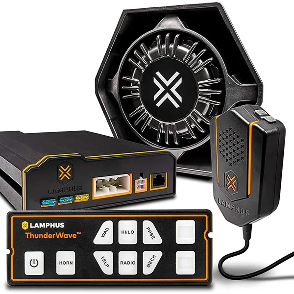 The LAMPHUS ThunderWave Siren System represents a professional-grade emergency warning system designed for vehicles and emergency response applications. Its SAE J1849 rated siren amplifier and 100W compact speaker deliver impressive audio output between 126-134 dB, ensuring clear audible warnings in critical situations.